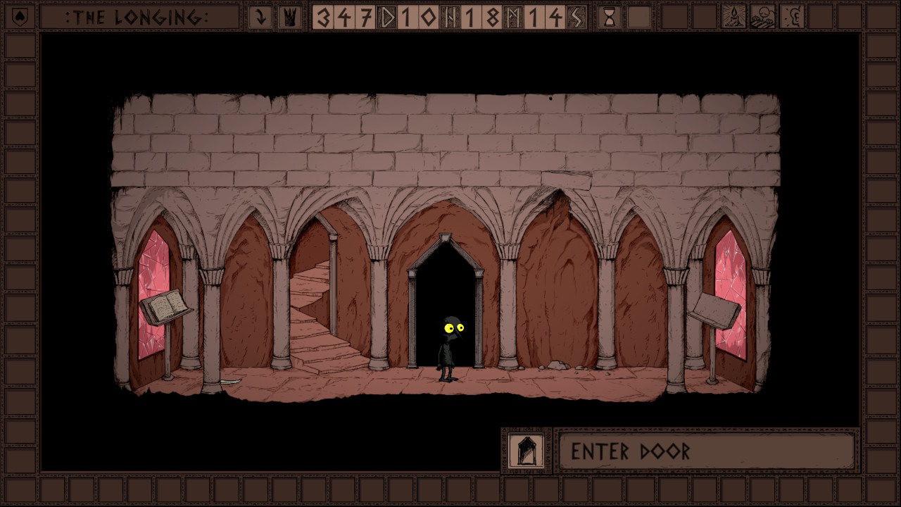 It seemed that I hadn’t missed one room, but two! The stairs led Monty to another room that was much like the last, only flipped around – they were mirror images of one another. This time there was a single of paper standing on the lecturn; I asked Monty to grab it and then exited through the doorway. Monty emerged in between another two doorways – one seemed to lead to an adjoining hallway heading east, and the other was flanked by pink stone pillars, perhaps signifying its importance… This might be the breakthrough I’ve been waiting for! Monty stepped through the doorway and…