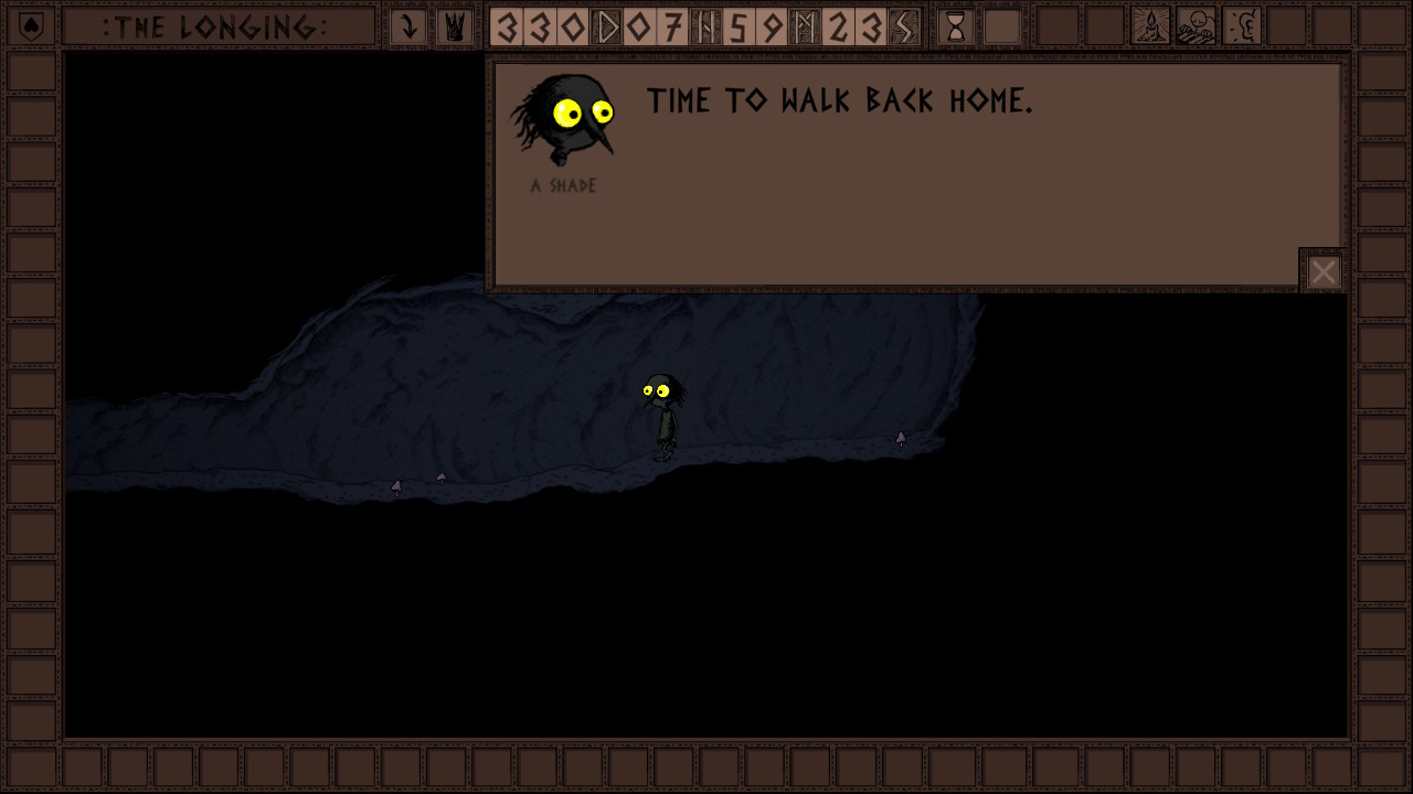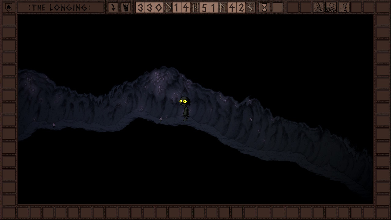 I loaded The Longing again and had Monty pluck and eat one purple mushroom growing near the [tall ledge] to make room. I then had him toddle back down into the caves to pick up a green fungus and bring it back; I had him plant it as close the crook-fungus as I could… Here goes nothing…