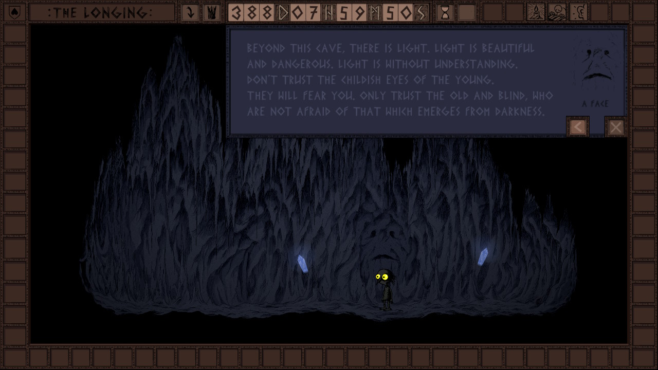 Now, it certainly sounded to me like I needed Monty to eat more ‘shrooms to delve deeper into his own psyche, and that he might make it out of the cave, but to not trust the young troll, and to emerge only when the blind man was around. I’m not sure how those things can both be true – the dreams are either Monty’s past or they’re what’s going on outside – surely they can’t be both? I’ll have to keep refining my theory… While The Face’s answers were far from concrete, they added another level of intrigue to affairs – not only did I have a little bit of (vague) guidance on what to do, but I had someone I could come back to for advice should we get stuck. All the while, Monty never batted an eyelid at The Face’s sagely wisdom and just stood there making me feel awkward. Perhaps he’ll add his thoughts about it to his diary for digestion later though.