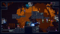 Upgrades will periodically be dropped onto the screen to help you in your battle against the robots and there’s a fair amount of choice on offer here too. There’s new weapons like a shotgun or uzi, body armour for extra shields, an auto-revive bot, health items, and loads of others. While it’s fun to try them all out and see what works best for your play style, there are a number of items that don’t really have any benefits at all – like the boosted jump boots that are entirely useless in a game where you can alter gravity, and the grenades that are too slow to use and routinely just end up exploding on an empty patch of ground (or ceiling if you get in a muddle while you’re upside down).