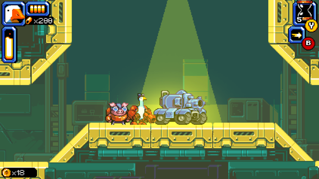 Mighty Goose sees you blast your way through hordes of enemies in a traditional run-and-gun shooter, dodging a bombardment of enemy fire on your way to a showdown with a larger than life boss that takes a lot of bullets to bring down. All of the key elements of the genre are there – weapon pick-ups that offer you a temporary upgrade in firepower, selectable secondary items like grenades/shields, and limited health that requires you to stay to your toes lest your goose be cooked! And in a clear homage to Metal Slug – one of the grandaddies of arcade shoot ‘em ups – there’s a collection of crazy vehicles dotted throughout the levels that add a change of pace to the action and really help to mix up the play style as well.