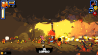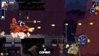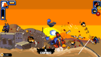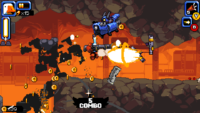 While he’s very nicely drawn, Mighty Goose himself is probably the most understated sprite out of the bunch, with the floods of enemies taking centre stage and drawing the attention of your eyes. Enemies are chunky, vibrant and beautifully shaded, allowing you to quickly identify the different threats amidst the bedlam of pixelated gunfire and explosions, making busy screens much more manageable. And while each individual enemy is uniquely depicted, each set of baddies has a strong overarching visual theme that ties them all together, offering a wonderful consistency that makes you believe that the individual units are part of the same greater whole. And even amongst a myriad of well drawn and animated sprites, the madcap Metal Slug-inspired vehicles manage to stand out above the rest, with each one displaying considered individual designs and impressive fluid movements that jump off the screen.