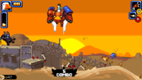 The sprites definitely make for wonderful viewing, but it’s arguably the animations that are the key feature in making the experience as enjoyable as it is. Every single encounter in Mighty Goose is punctuated with clouds of semi-transparent dust and smoke, an endless stream of tiny bullet casings and crisp explosions that transform the screens into a series of beautiful little warzones. There’s some lovely cinematic touches that raise the bar too, with the use of slow motion and large character facial expressions overlaying the action to accentuate just how cool the carnage really is. The only downside to having so much craziness on screen at once is that enemy fire can sometimes get lost in the mass of explosions and scattering debris, and you’ll often take damage without really knowing what’s hit you. Health items are relatively plentiful though and you’re not necessarily doomed as a result, but it did lead to me having to replay trickier sections of the game a few times as I struggled to track enemy gunfire through the mayhem.