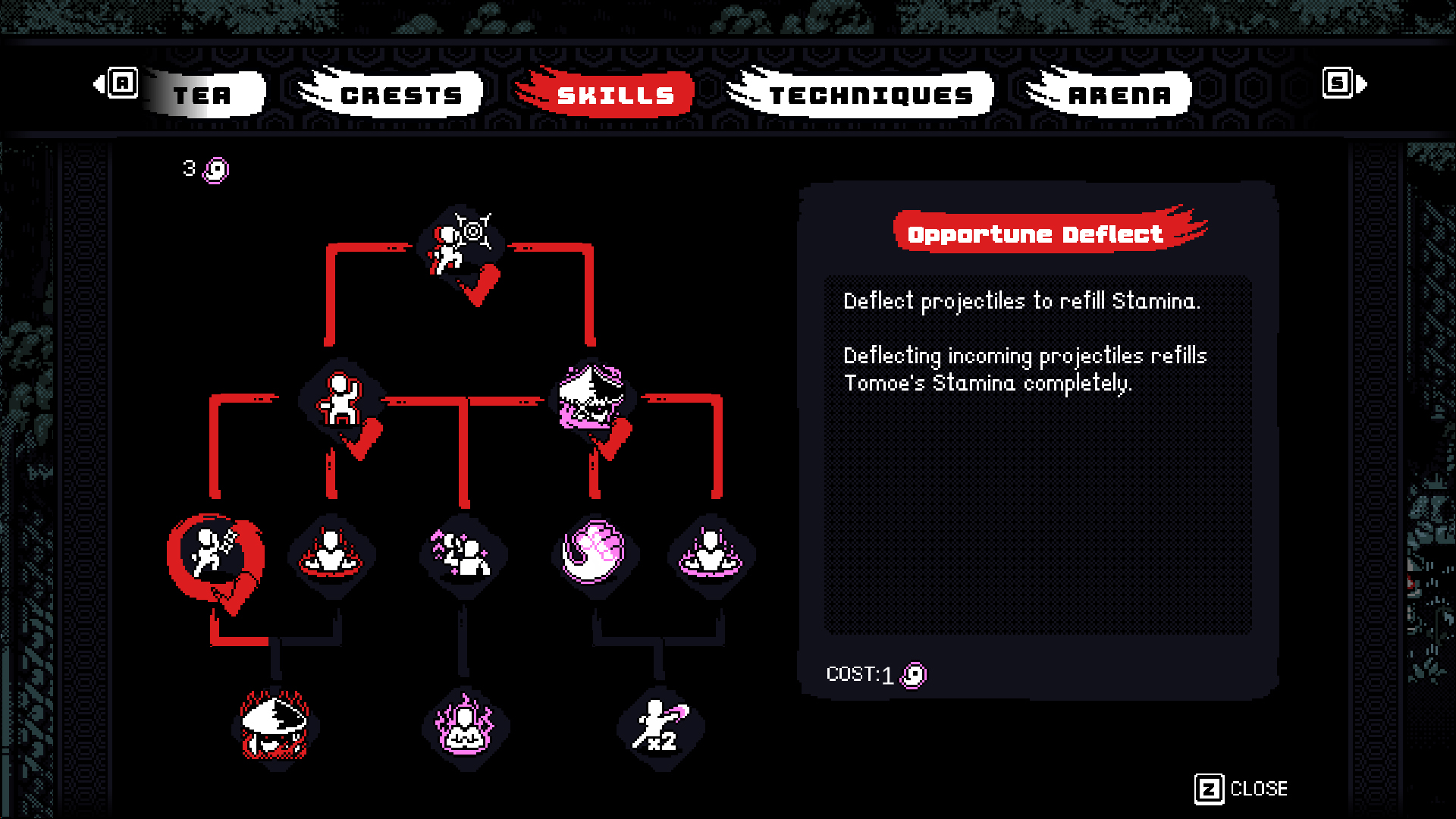 As players traverse the pixel art world of Bakugawa they’ll gradually uncover a deep and emotional story that tells of Tomoe’s resistance against the Shogun and the reasons for giving up her blade. Going hand in hand with the story is the combat skill tree which can be upgraded throughout the game. This gives Tomoe additional powers that will help quell the onslaught of Akechi. These include a devastating dash attack that knocks enemies out for the count and the ability to deflect projectiles.