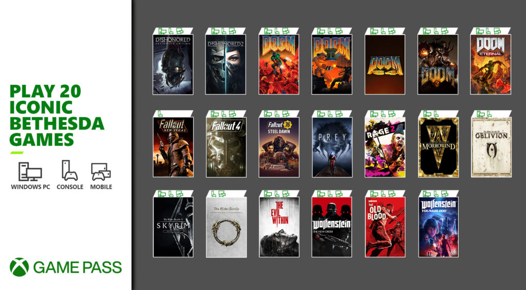 Microsoft are flexing their latest acquisition by casually dropping 20 of Bethesda’s games of Game Pass today. The full list can be found in the image above, but for those who prefer a list can find it here: