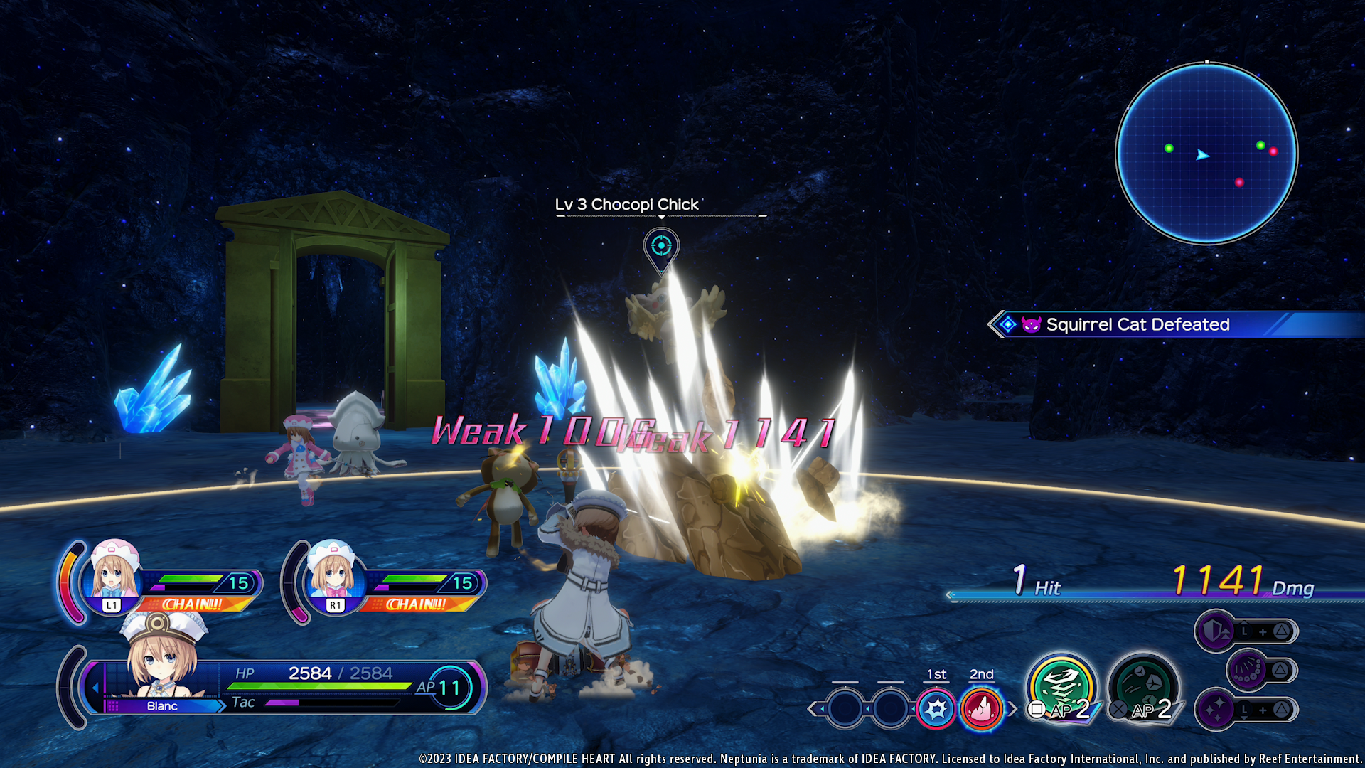 The trouble with the dungeon crawling is that it quickly becomes repetitive and sadly, downright boring. I found myself grinding each dungeon multiple times to level up, as experience is only doled out for battle wins. After a while, the levels start to blur into one and with only a handful of options -field, cave, building and more caves- there is not much variation within the individual levels. And despite playing the game on PS5, the visuals felt like a step back from Neptunia ReVerse. Rather than the oversaturated brightness in last year’s remake, each area had the same, flat lifeless backgrounds, with only a slightly different layout each time, and even though they reuse the same assets as previous games, the absolute worst issue came with Nepgear and her team’s awful battle cries. After thirty hours of gameplay, I can still recite “If you want to go past me, you have to go fasterrrrr”, as it was repeated with such frequency and had no way of turning it off. The lack of care and attention to these levels is a wasted opportunity. With such pretty artwork that’s seen elsewhere in the world, it would have been nice to see a bit more thought go into these sections, though I will say that the DualSense vibrating in sync with every step was a nice touch.