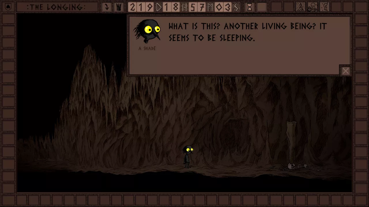 Monty exclaimed as he found a fork in the road and doubled back on himself to head eastward and uphill instead of going west towards [The Well]. Bingo! Slowly the darkness gave way to the murky light of a cave, and an angry maw of stalactites came into view, along with something else…