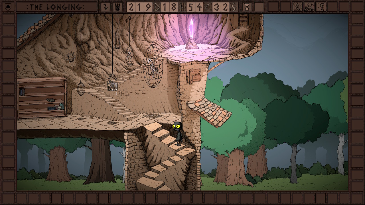 The higher that Monty climbed the tighter the stairway became and the more light poured in from above. This is a tower, isn’t it? Very soon the tower staircase took Monty above ground, albeit still inside, and a vista of the forest sprawled out on both sides beyond the rough building that Monty now found himself in. It was a pretty creepy affair. There was a bookcase with a few tomes strewn across it’s shelves and the staircase continued upwards to a pedestal housing a large pink crystal. More eye-catching though was the collection of animal skeletons hanging in cages throughout the room… Who the hell was this guy, and what was he doing?!