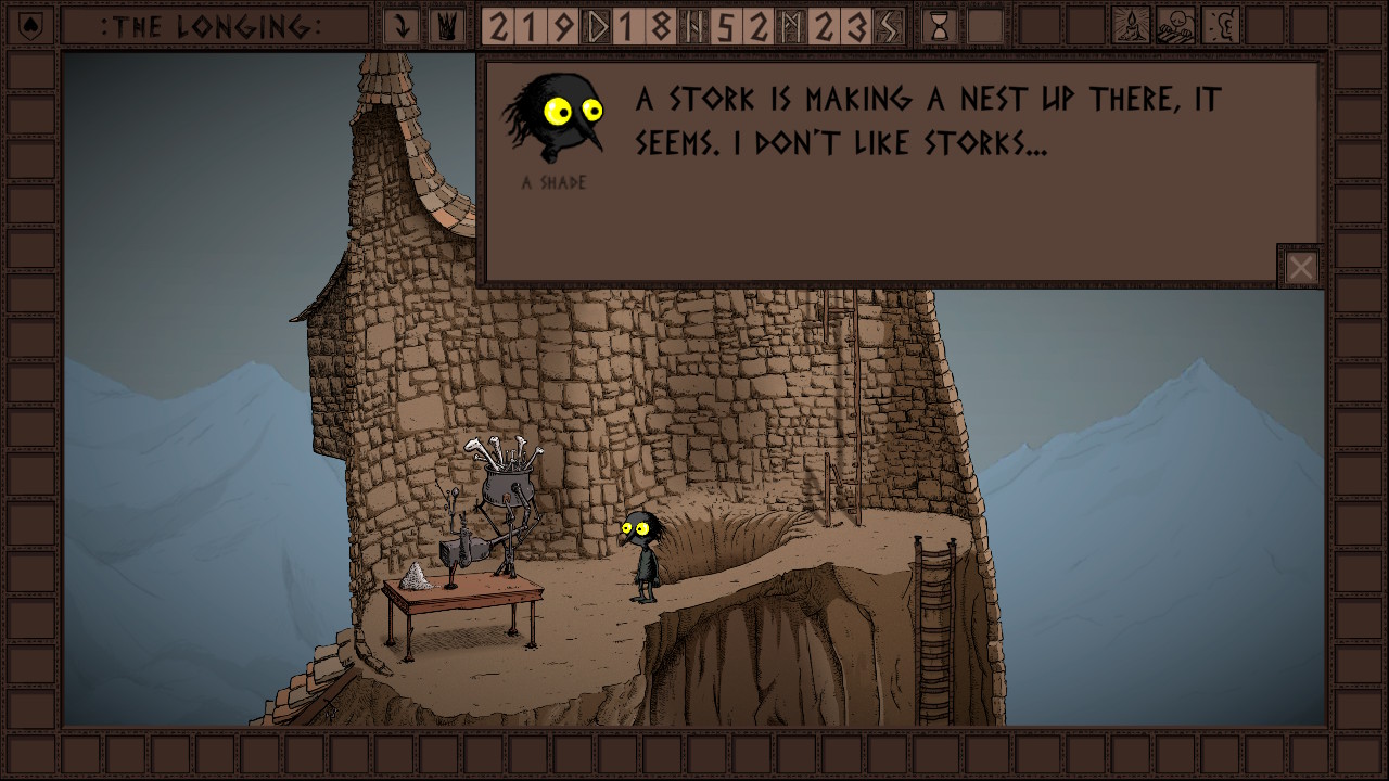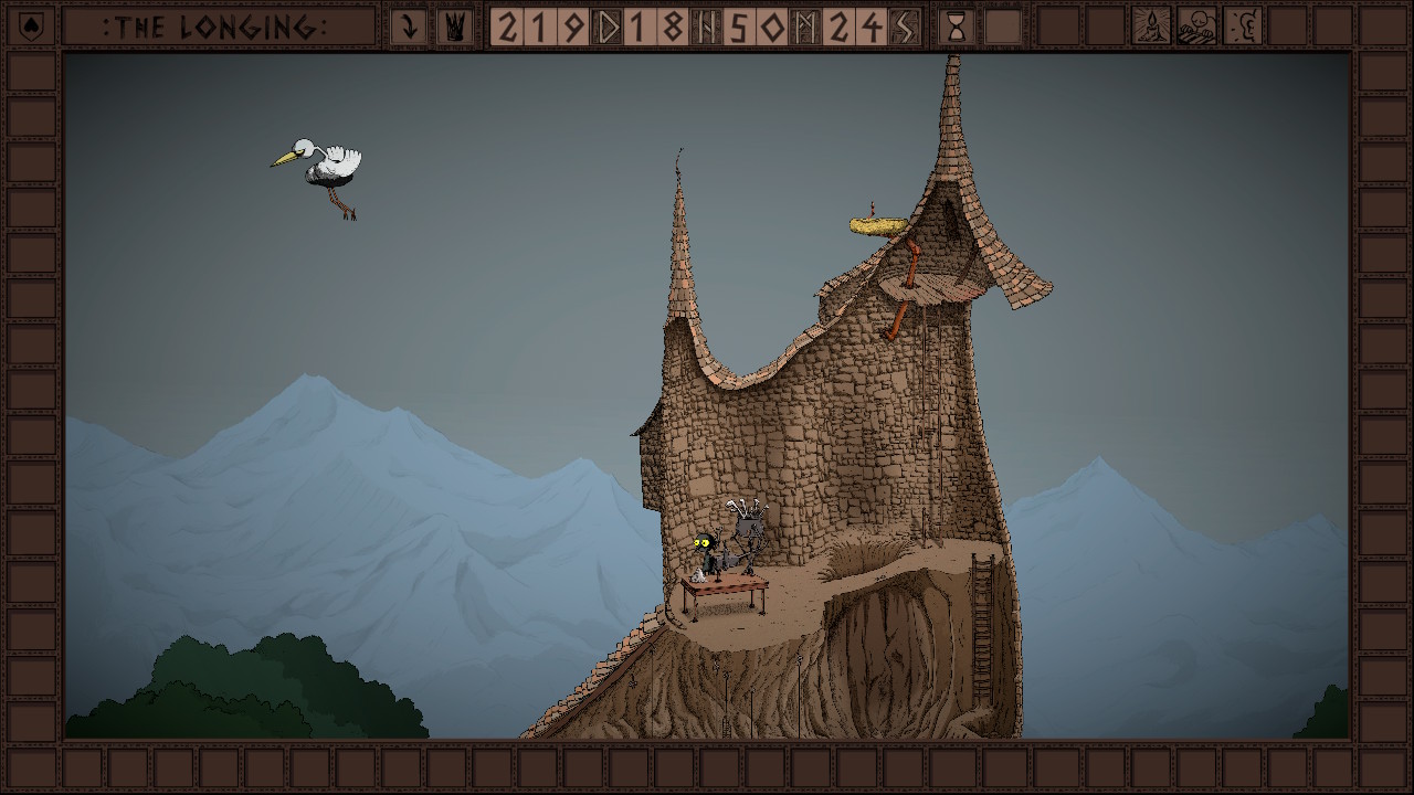 Urged on by nothing more than morbid curiosity, I had Monty walk over to examine the pot further but he didn’t have anything to say about it. Sure, ’cause this isn’t completely weird at all, is it? As Monty stood alongside the contraption the camera zoomed out, giving a broad view of the mountains in the background and a bird flying past in the distance. We waited for a while until the camera had stopped zooming out and then a little while longer still, since I was curious about what exactly I was supposed to be looking at.